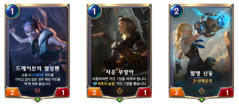 ▶드레이븐 : 회전 도끼(즉발 주문으로 사용하려면 카드 1장을 버려야 하며 이번 라운드의 아군 하나에게 1/0을 부여한다.)로 두 번 타격하면 레벨 업한다. 사용 또는 타격 시 회전 도끼를 하나 생성한다. 선제공격(공격 시 방어 유닛보다 먼저 타격)과 압도(공격력이 방어 유닛의 체력보다 높은 만큼 넥서스 타격) 특성을 갖고 있다. 신속 주문으로 드레이븐의 죽음의 소용돌이(전투 중인 아군 하나가 전투 중인 적 하나를 타격)가 있다.