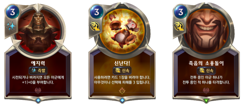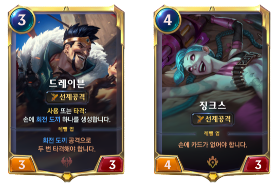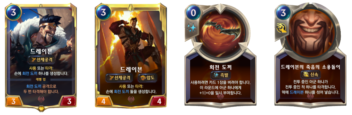 ▶드레이븐 : 회전 도끼(즉발 주문으로 사용하려면 카드 1장을 버려야 하며 이번 라운드의 아군 하나에게 1/0을 부여한다.)로 두 번 타격하면 레벨 업한다. 사용 또는 타격 시 회전 도끼를 하나 생성한다. 선제공격(공격 시 방어 유닛보다 먼저 타격)과 압도(공격력이 방어 유닛의 체력보다 높은 만큼 넥서스 타격) 특성을 갖고 있다. 신속 주문으로 드레이븐의 죽음의 소용돌이(전투 중인 아군 하나가 전투 중인 적 하나를 타격)가 있다.