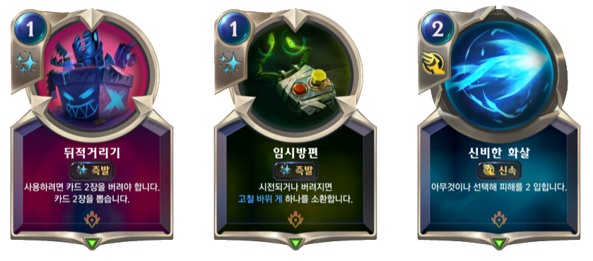▶임시방편(필트오버) : 즉발 주문으로 시전 하거나 버려지면 고철 바위 게(능력치 1/1)를 소환한다.