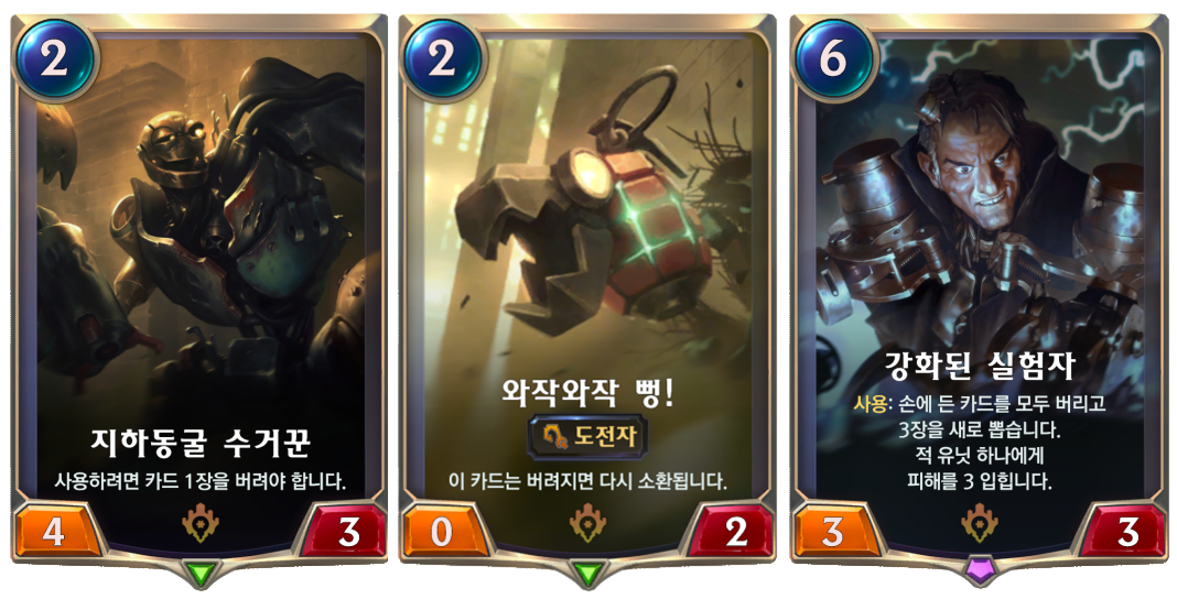 ▶추종자 : 드레이븐의 열성팬×3, 자운 부랑아×3, 발명 신동×3, 지하동굴 수거꾼×3, 와작와작 뻥!×3, 강화된 실험자×3