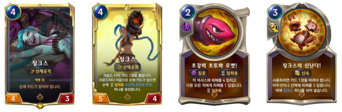 ▶징크스 : 손에 카드가 없어야 레벨 업한다. 레벨이 오르면 라운드 시작 시 카드 1장을 뽑고 손에 카드가 없으면 일회용(라운드 종료 시 카드 버려짐) 집중 주문(전투 중이 아닐 때 사용, 대응 가능) 초강력 초토화 로켓(넥서스에 피해를 4 주고 모든 적에게 피해를 1 준다.)을 얻는다. 선제공격 특성이 있으며 신속 주문(아무 때나 사용, 대응 가능) 징크스의 신난다(카드 1장을 버리고 피해를 3 준다)가 있다.