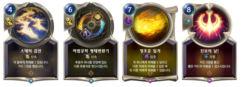 ▶진보의 날(필트오버) : 즉발 주문으로 카드 3장을 뽑고 뽑은 카드의 비용을 1 감소시킨다.