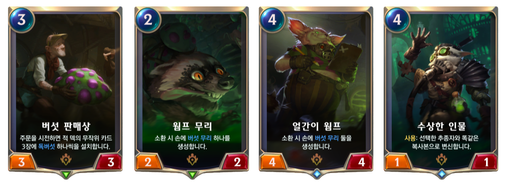 ▶웜프 무리(필트오버) : 소환 시 버섯 무리(적의 카드 5장에 독버섯을 설치) 하나를 생성한다.