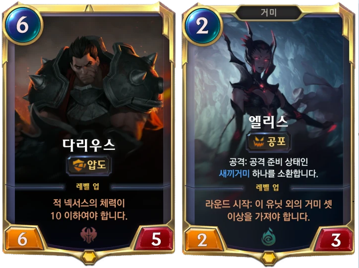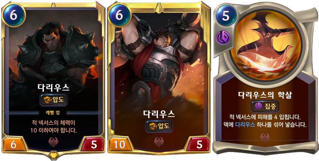 ▶다리우스(녹서스) : 적 넥서스의 체력이 10 이하이면 레벨 업. 압도(공력력이 방어 유닛의 체력보다 높은 만큼 넥서스 피해)를 갖고 있다. 챔피언 주문으로 다리우스의 학살(집중 주문. 적 넥서스에 피해를 4 준다)이 있다.