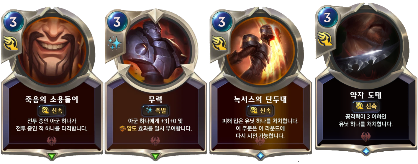 ▶녹서스의 단두대(녹서스) : 희귀급 카드. 신속 주문. 피해 입은 유닛 하나를 처치한다. 이번 라운드에 재시전 가능하다.