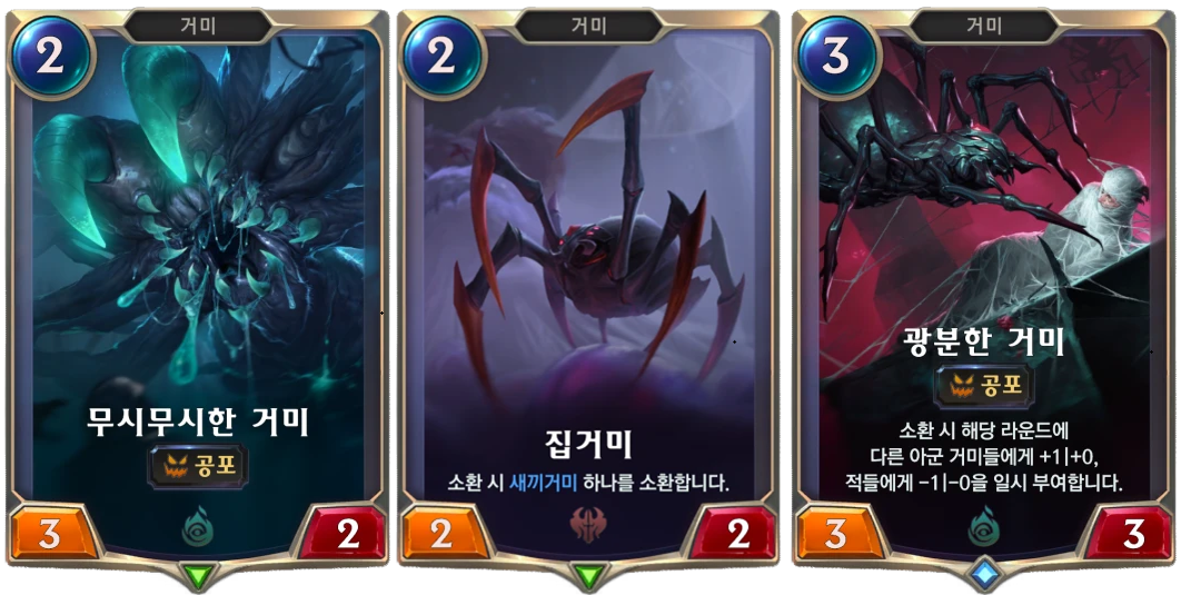 ▶광분한 거미(그림자군도) : 희귀급 카드. 공포(공격력 3 이상인 유닛만 방어 가능)가 있으며 소환 시 해당 라운드에 아군 거미들에게 1/0, 적들에게는 -1/-0 을 부여한다.