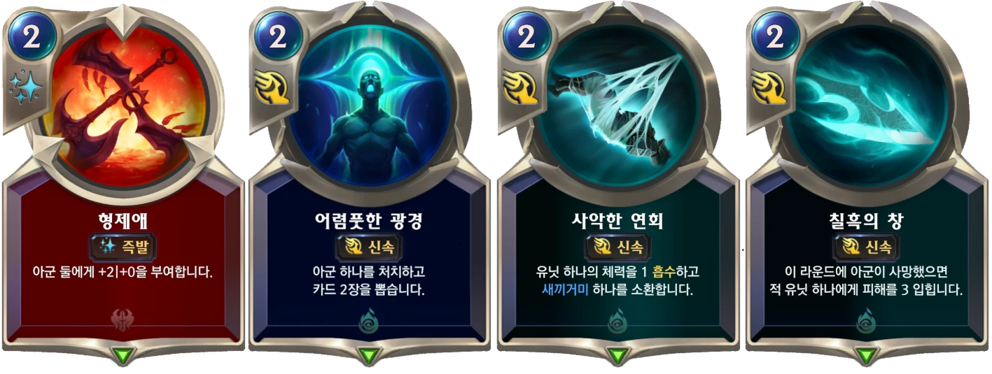 ▶형제애(녹서스) : 즉발(즉시 발동. 대응 불가) 주문. 아군 둘에게 2/0을 부여한다.