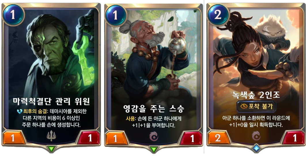 ▶녹색숲 2인조(아이오니아) : 희귀급 카드. 포착 불가(포착 불가 유닛만 방어 가능)를 갖고 있다. 아군 소환 시 이번 라운드에 1/0을 획득한다.
