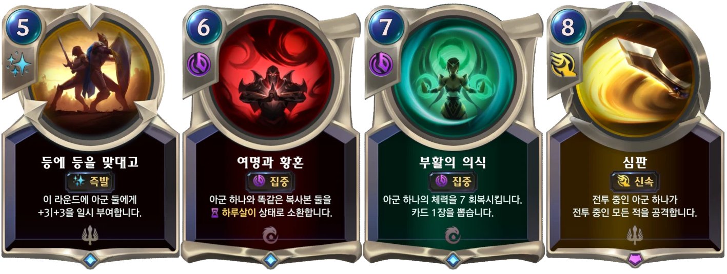 ▶부활의 의식(아이오니아) : 희귀급 카드. 집중(전투 중 사용불가, 대응 가능) 주문. 아군 하나의 체력을 7 회복하고 카드 1장을 뽑는다.