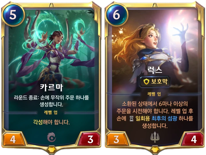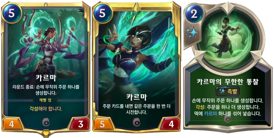 ▶카르마(아이오니아) : 각성(마나가 10에 도달)해야 레벨 업. 라운드 종료 시 손에 무작위 주문 하나를 생성한다. 레벨이 오르고 주문 카드를 내면 같은 주문을 한 번 더 시전한다. 챔피언 주문으로 카르마의 무한한 통찰(즉발 주문. 손에 무작위 주문 하나를 생성한다. 각성 시 주문을 하나 더 생성한다)이 있다.