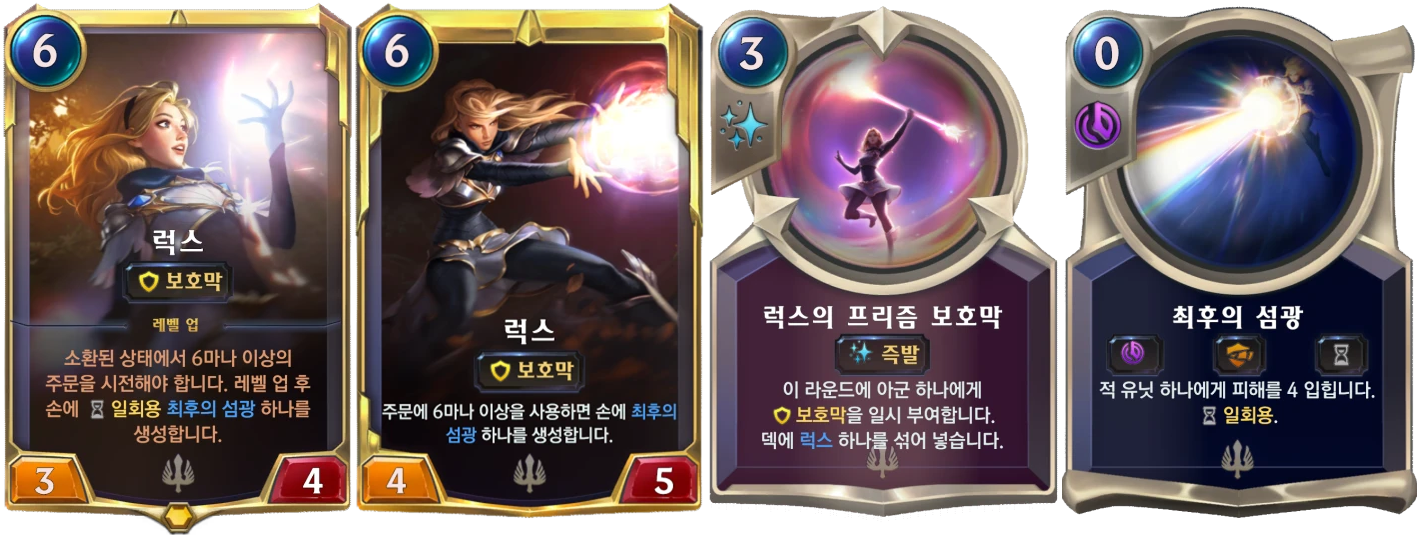 ▶럭스(데마시아) : 소환된 상태에서 6마나 이상의 주문을 시전하면 레벨 업. 레벨이 오르면 최후의 섬광[집중 주문. 일회용 주문. 압도(공격력이 방어 유닛의 체력 보다 높은 만큼 넥서스 피해) 효과] 하나를 손에 생성하고 6마나 이상의 주문 사용 시 최후의 섬광 하나를 손에 생성한다. 챔피언 주문으로 럭스의 프리즘 보호막[이 라운드의 아군 하나에게 보호막(다음 피해 무효)을 일시 부여한다]이 있다.