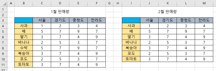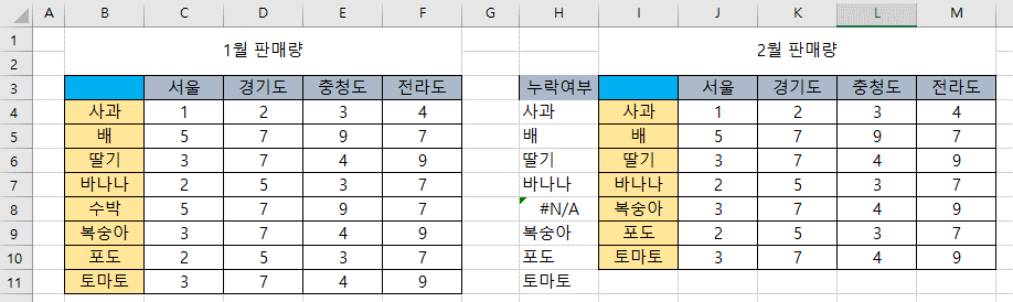 ▶매달 판매량 리스트를 작성한다고 가정했을때, 2월의 과일리스트는 누락이 발생되어 1월의 과일리스트와 2월의 과일리스트가 다른 경우이다. 리스트의 수량이 적다면 눈으로 쉽게 찾을 수 있지만 종류가 수백가지라면 눈으로 찾는 것은 매우 비효율적인 일이다.