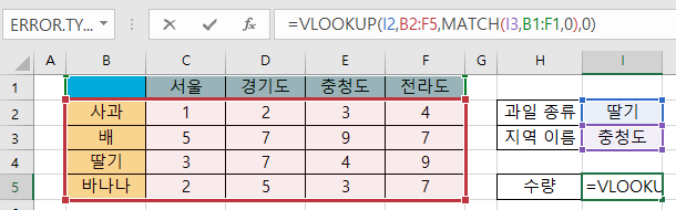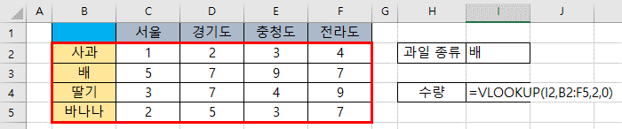 ▶위의 예제를 보더라도 배와 같은 값을 찾을 수는 있지만 서울이나 경기도의 수량을 찾기 위해서는 col_index_num(행 이동)을 일일이 수정하는 번거로움이 있다.