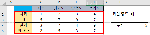 ▶과일의 종류와 지역이름을 작성하면 해당 항목의 수량이 나오게 된다.