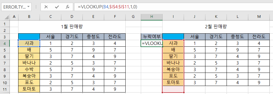 ▶위와 같은 결과 값이 나오게 된다. 1월의 과일 종류를 2월 과일 리스트에서 찾아 결과값을 나타내게 된다. B4셀의 값을 I4:I11에서 찾고 그 행의 첫 번째 값을 H4셀에 나오게 한것이다. 마찬가지로 B5셀의 값을 I4:I11에서 찾고 그 행의 첫 번째 값을 H5셀에 나오게 한것이다. 나머지 셀도 동일 작업의 반복으로 나오는 값이다. 하지만 수박은 2월의 과일 리스트에 없기 때문에 오류가 나게 된다. 결국 오류가 나게 되는 과일이 누락된 과일이 되는 것이다.