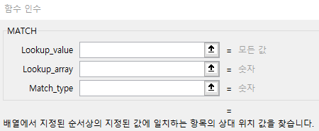 기본적인 구조는 MATCH(lookup_value, lookup_array, [match_type]) 으로 이루어져 있습니다.