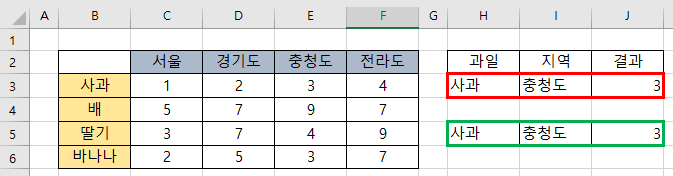 ▶빨간 박스의 MATCH 함수는 결국 사과의 행 순서인 2, 충청도의 열 순서인 4의 값이 된다. 즉 INDEX(B2:F6,2,3)과 같은 결과가 된다.