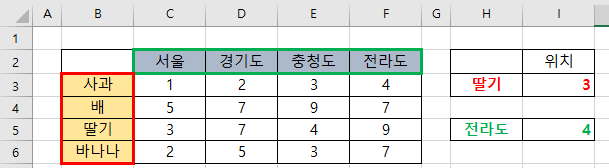 ▶빨간 네모 박스 : 과일을 범위로 지정하고 딸기가 몇 번째 순서에 있는지 알려준다.